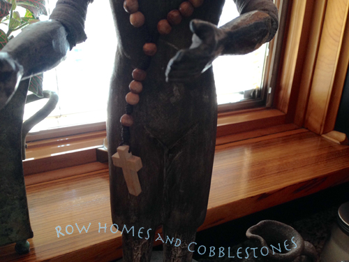 The Chinese wooden Buddha head was purchased 7 years ago from Material Culture in Philadelphia. We were told he is over a hundred years old. Now truth be told one day Max >^..^< spotted two pigeons on the small roof outside the window and in his graceful but unmeasured leap knocked Buddha to the floor. He already had a faint hairline age crack from his head down to his forehead but Max deepened the crack! Since we choose to live casually with our antiques we just chalked up his fall to a C'est la Vie Humpty Dumpty moment in life.